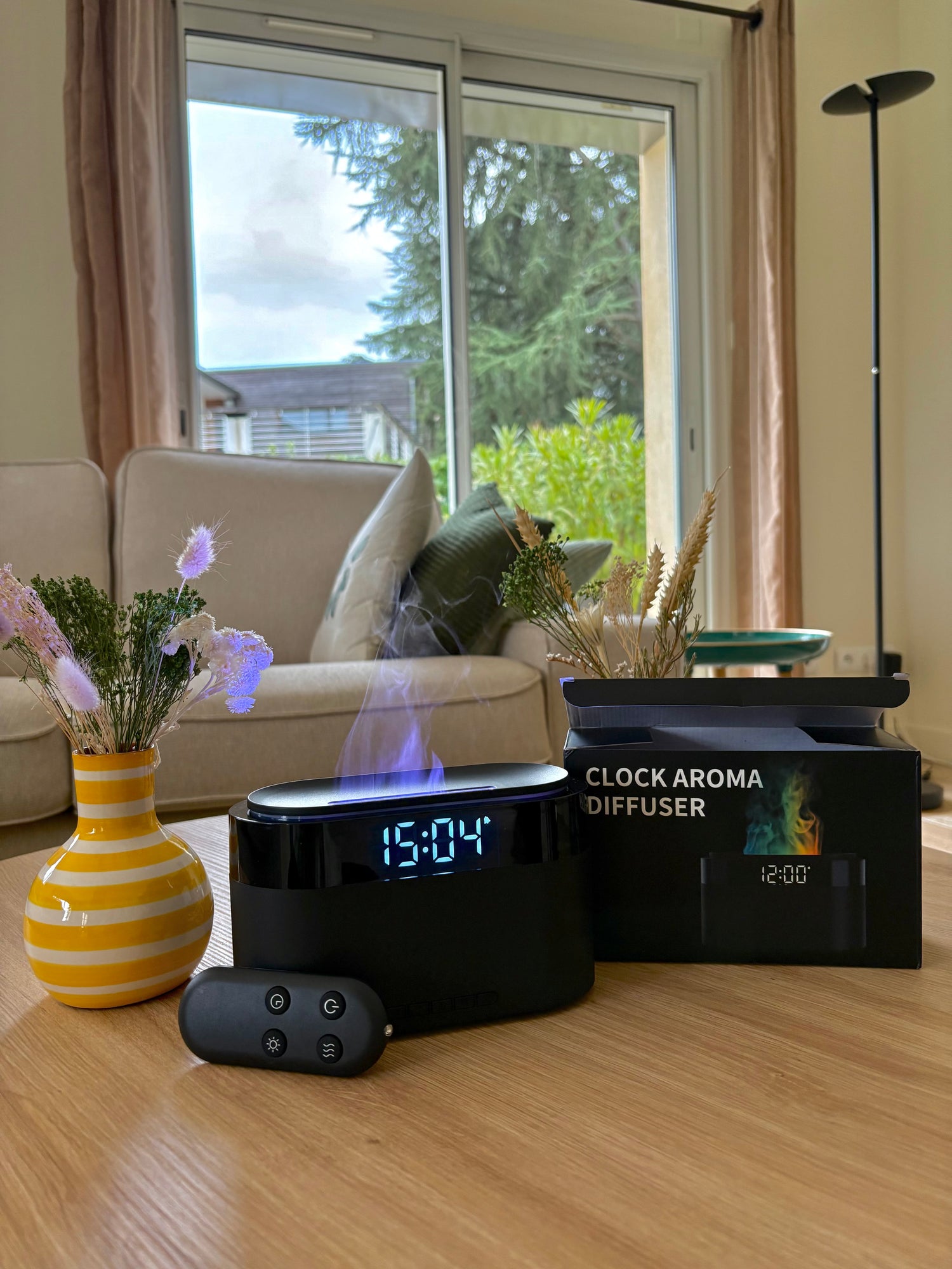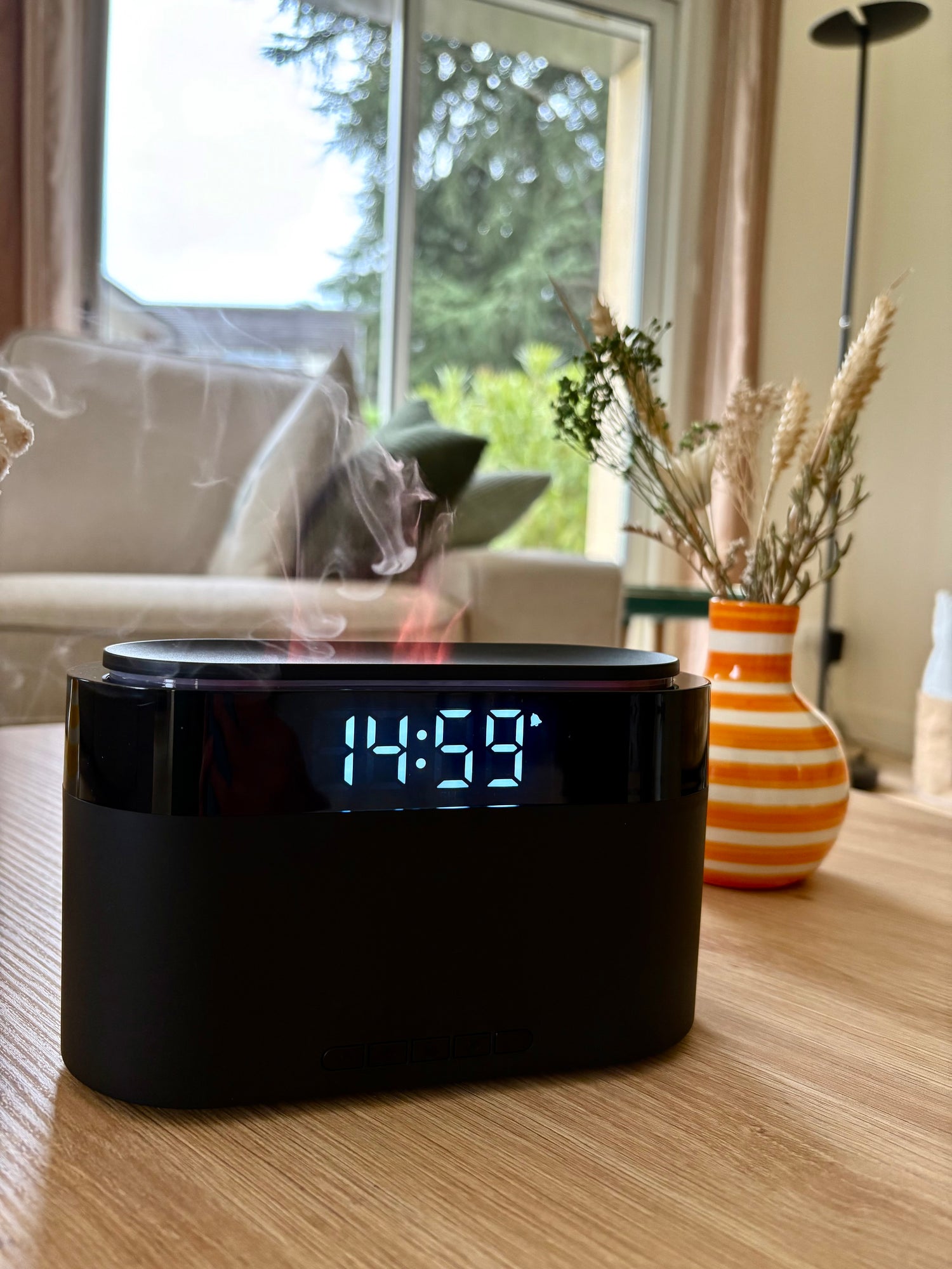 Réveil Diffuseur d'Huile Essentiels à Effet Flamme LED Design Noir & Blanc