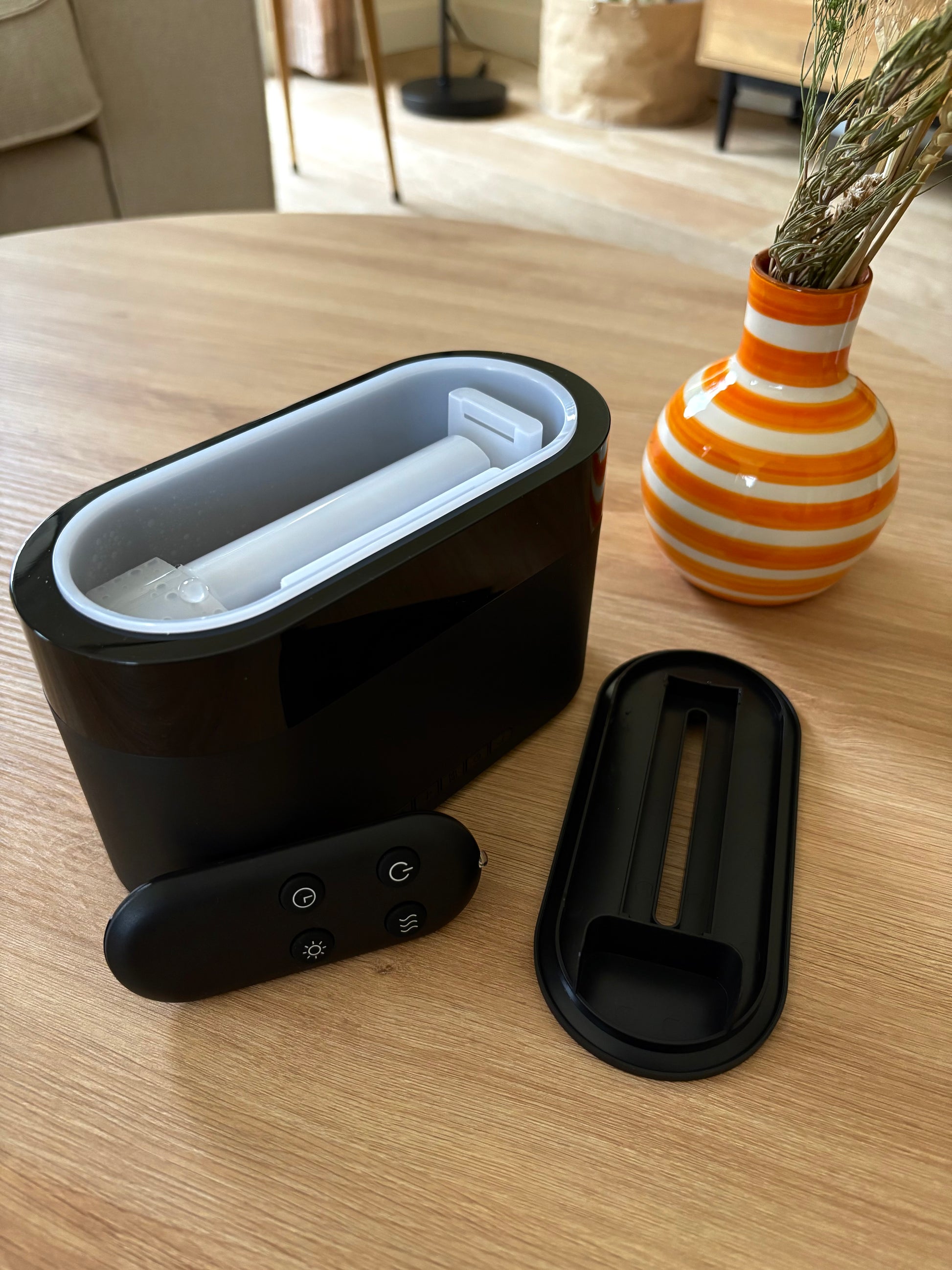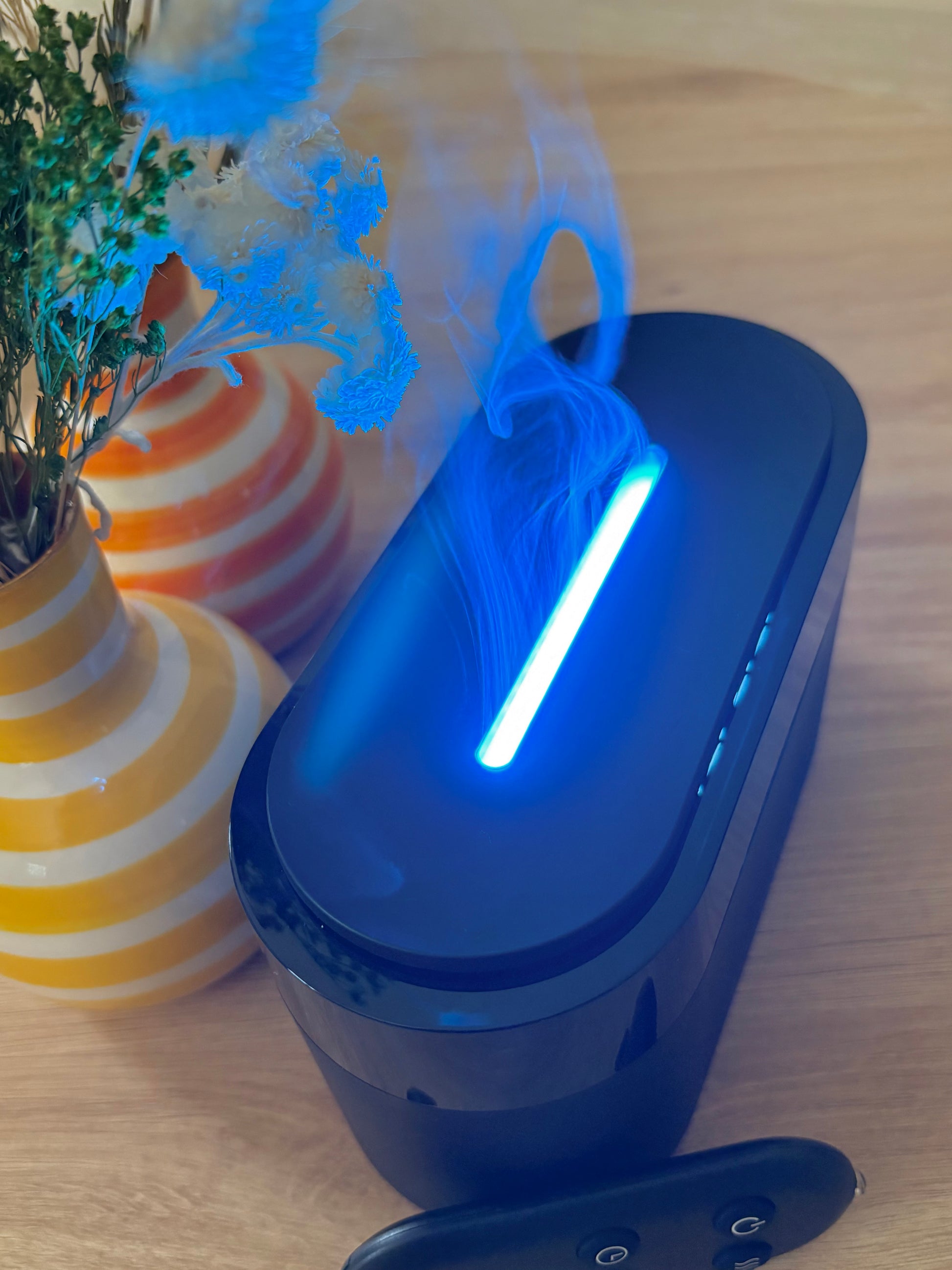 Vous pouvez aussi régler la durée de diffusion (grâce au minuteur intégré) et ajouter quelques gouttes d’huile essentielle pour une touche parfumée.